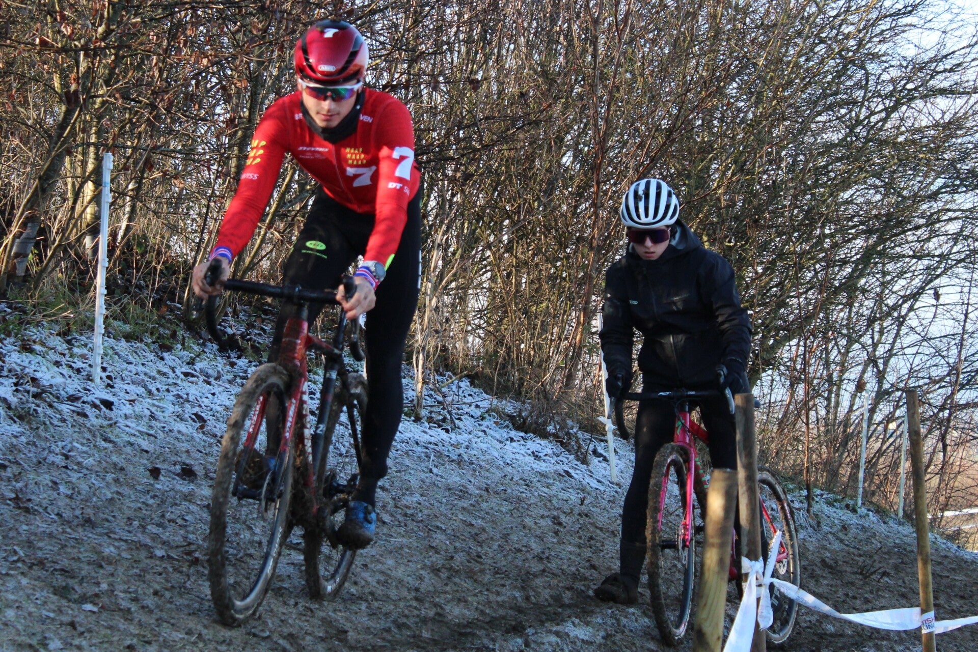 And indeed, the sun did its best, because as time went on and the other races came to an end, most of the course thawed and that could only be to Cameron's advantage, because he is a master in the mud! It was even thawed so much that many a crosser had to stop during the course reconnaissance to remove with their hands the large chunks of mud that blocked the bike.
